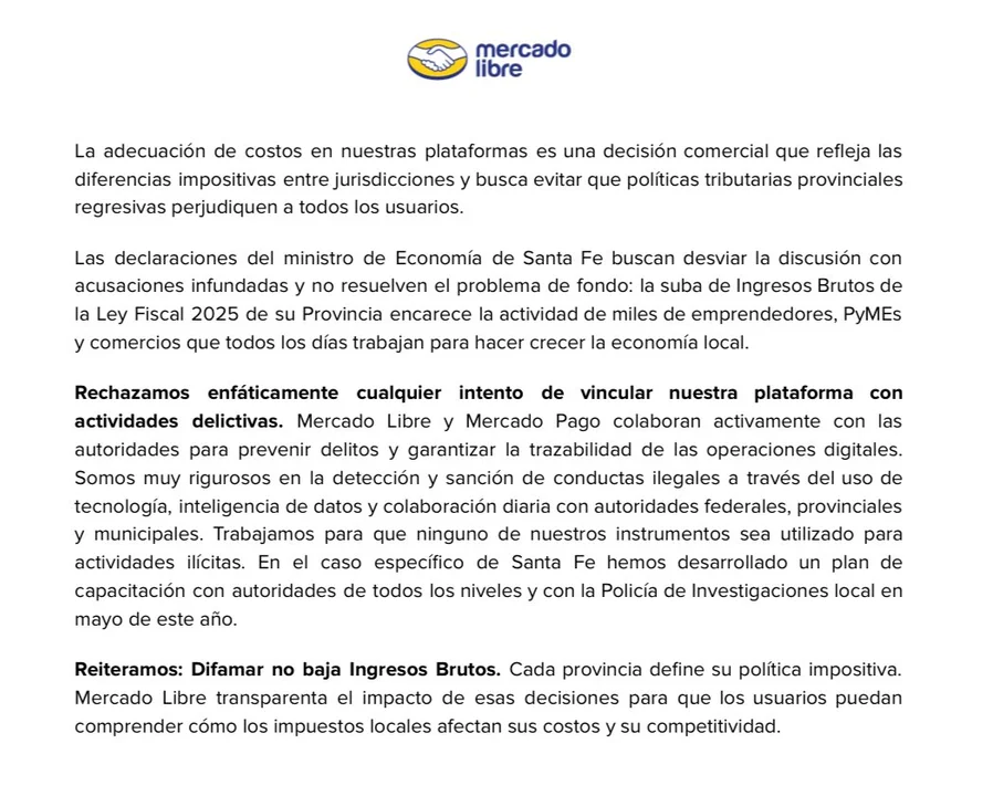 La empresa fundada por Marcos Galperin sostuvo que el cobro de Ingresos Brutos en la provincia santafesina "encarece la actividad de miles de emprendedores, PyMEs (Pequeñas y Medianas Empresas) y comercios, que todos los días trabajan para hacer crecer la economía local".