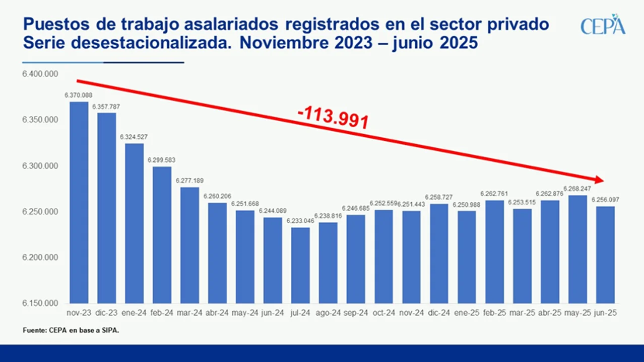 Desde el inicio de la gestión del presidente Javier Milei, el 10 de diciembre de 2023, hasta finales de junio de 2025, en Argentina se han perdido 334 empleos asalariados registrados por día.